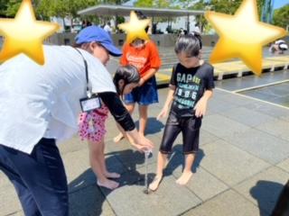 先生やお友達と水を掛け合って、