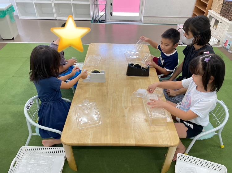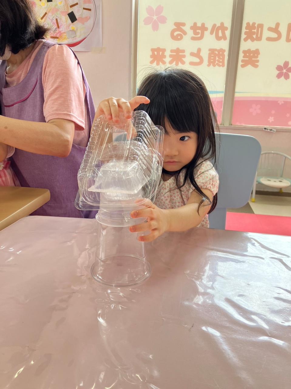 そこで、今日は大中小の透明のカップの中から、1人2、3個選び、自分のお城を作りました(*´꒳`*)