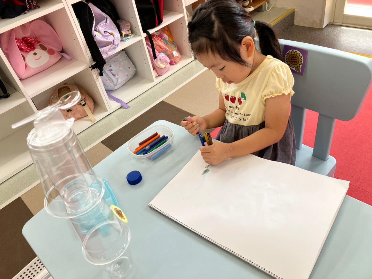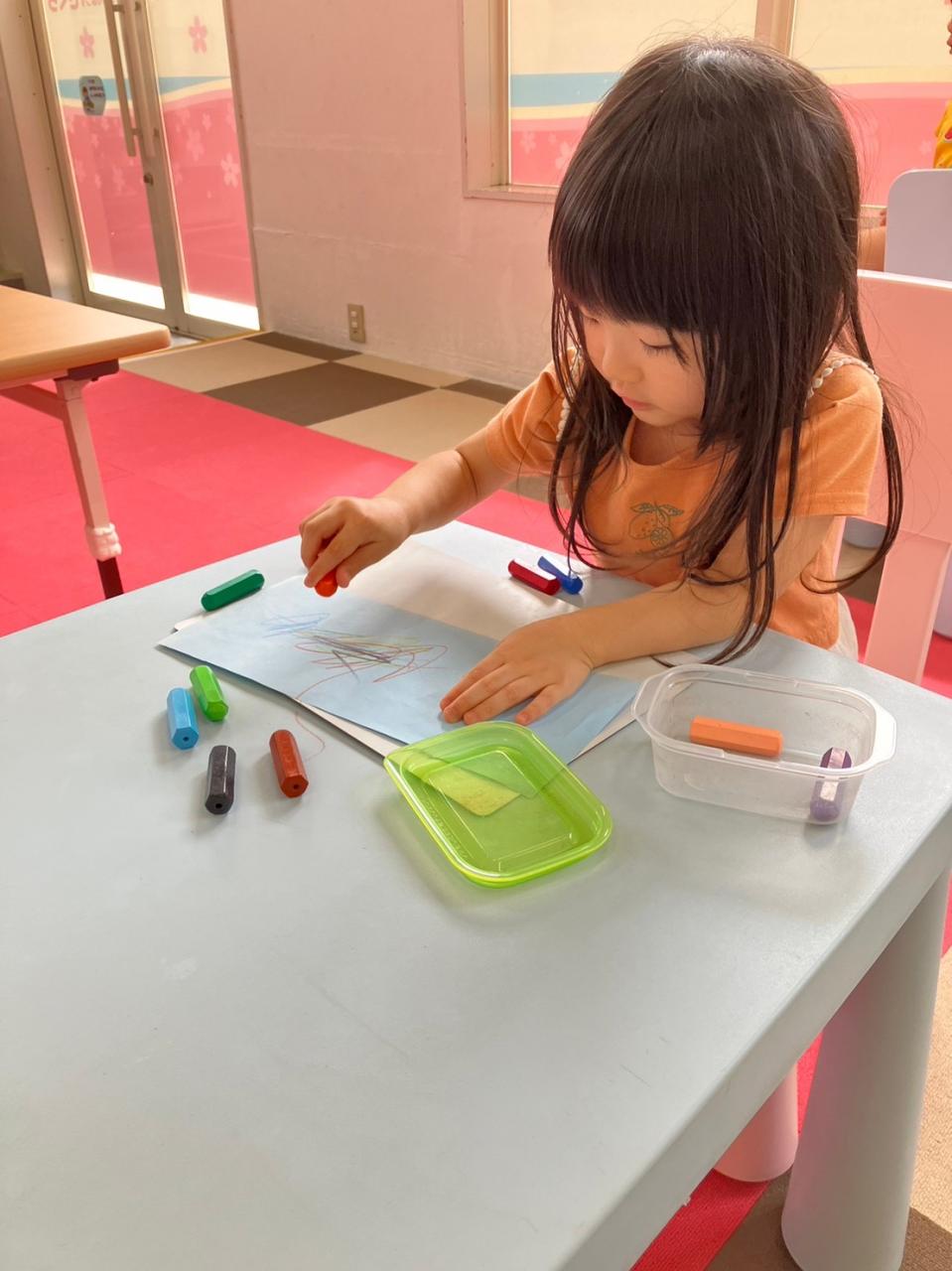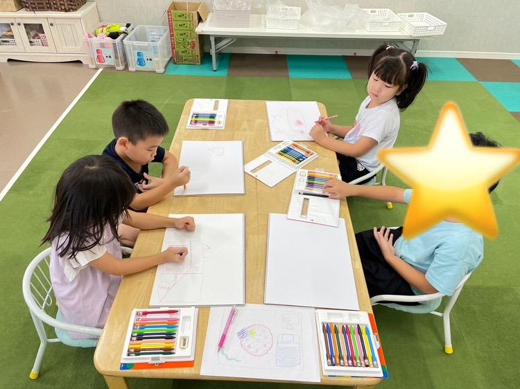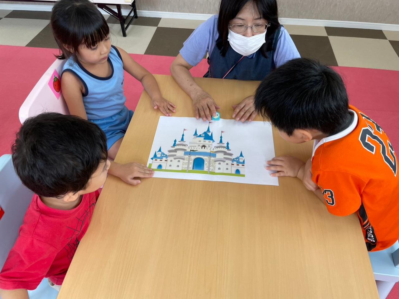 今日も、カップを使って作品作りをしたり、お城が完成した子は自分の考えた家や部屋を描いたりしました。