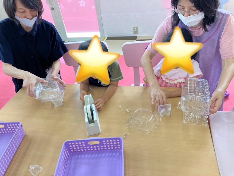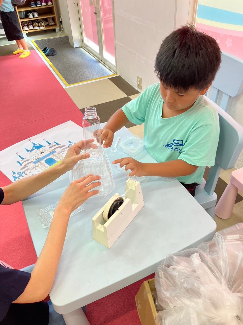 テープの使い方を確認しながら、どこに貼ったらカップとカップがくっつくのか、よく考えながら集中して作っていました☆