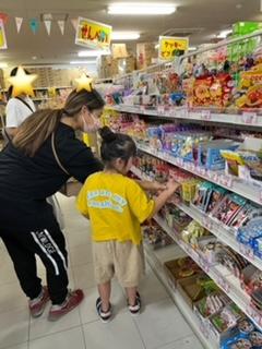 午前中、駄菓子屋さんへおやつを買いに行きました!「これ食べたいけど…こっちが買えないか…」と100円以内で買えるものを考えながら選びました。