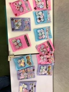 工作では、ペットボトルキャップを利用してキャンディやチョコに見立てたお菓子を作りました!!どれもとっても可愛く完成しました!