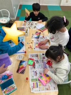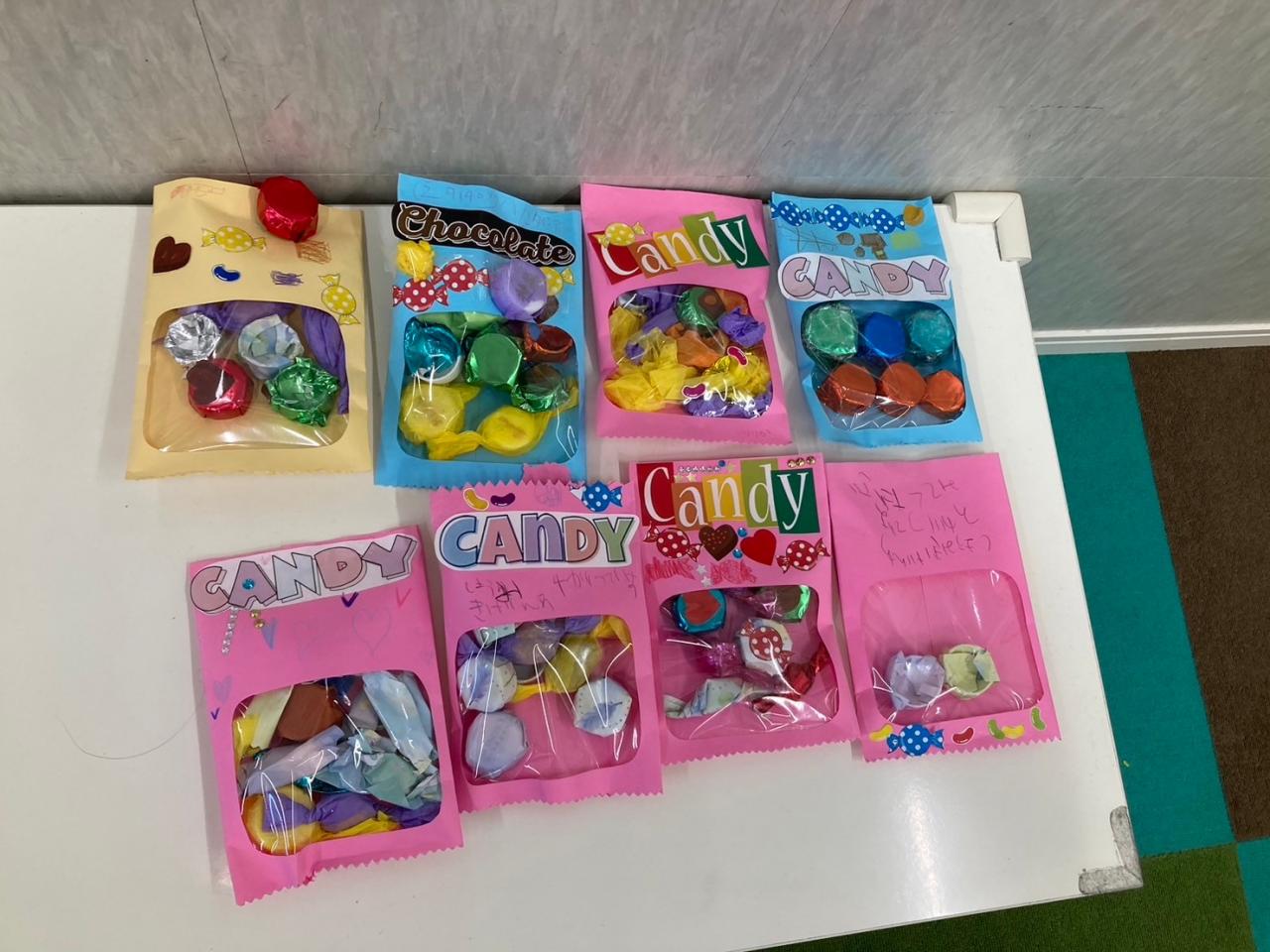 工作は、ペットボトルキャップや、折り紙などを使ってキャンディやチョコに見立てたものを作りました!!これまた可愛い作品ができました!