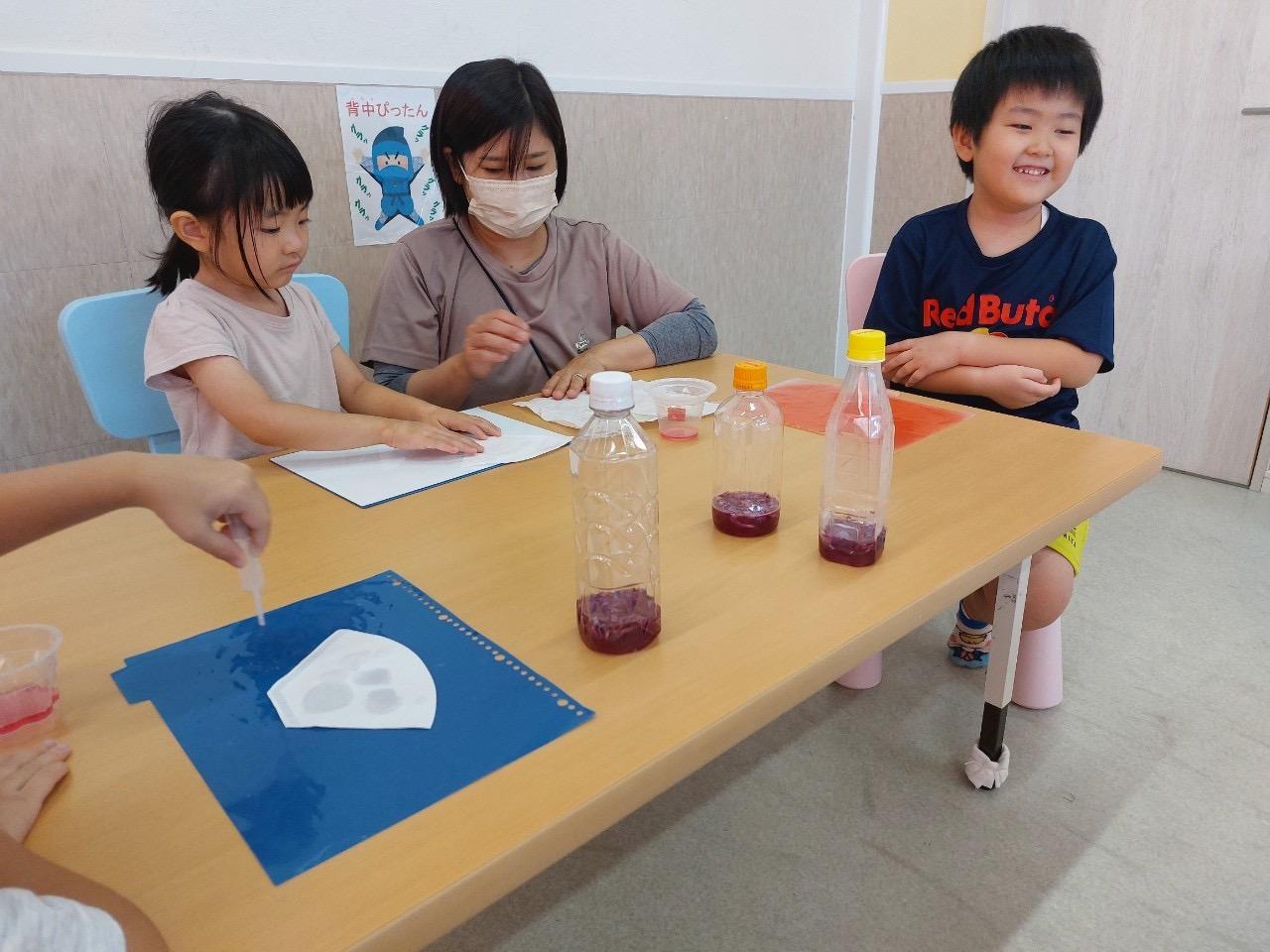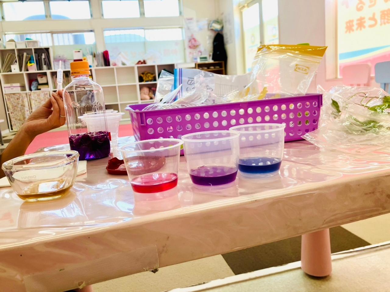 重曹とレモン水で色が変化する様子を観察しました。コーヒーフィルターにスポイトで色水を垂らし、素敵な作品が完成しましたよ(*´꒳`*)