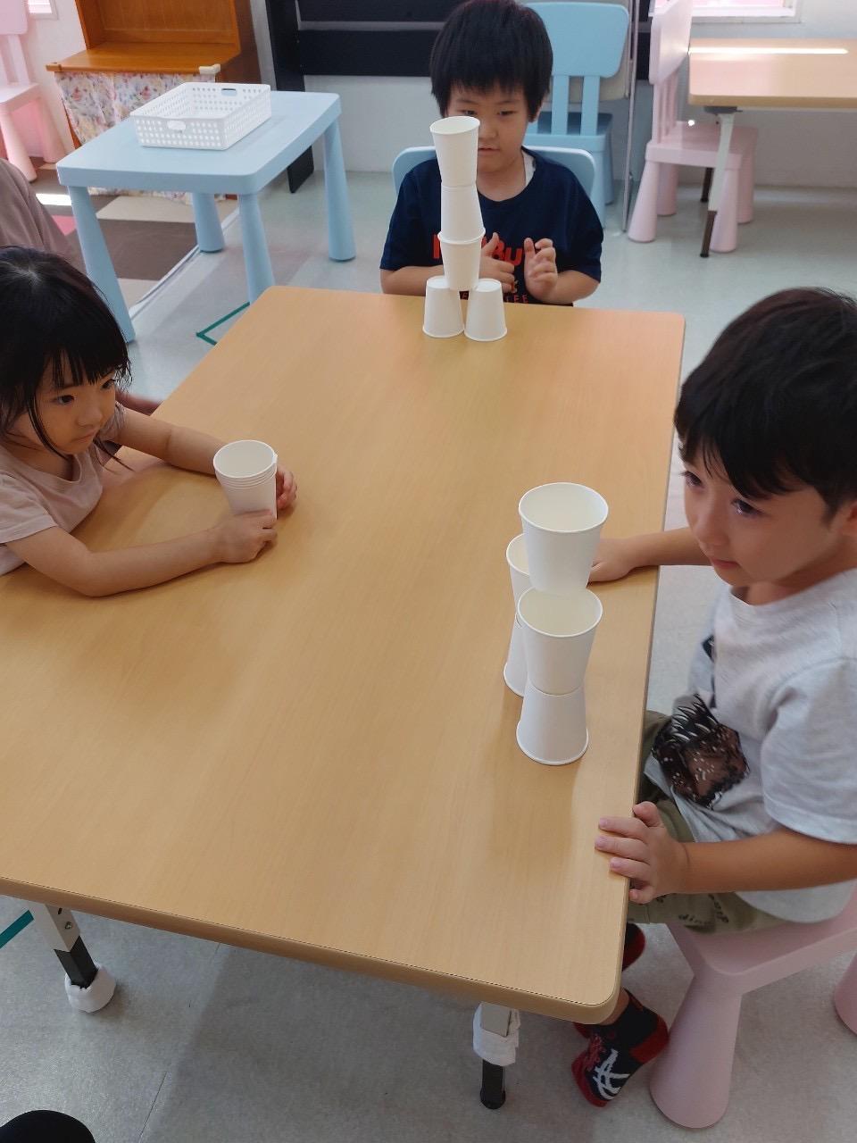 紙コップタワーでは、高く積むにはどうしたらいいか考えながら積んだり最後にはたくさんのコップを使ってお城という大作も!