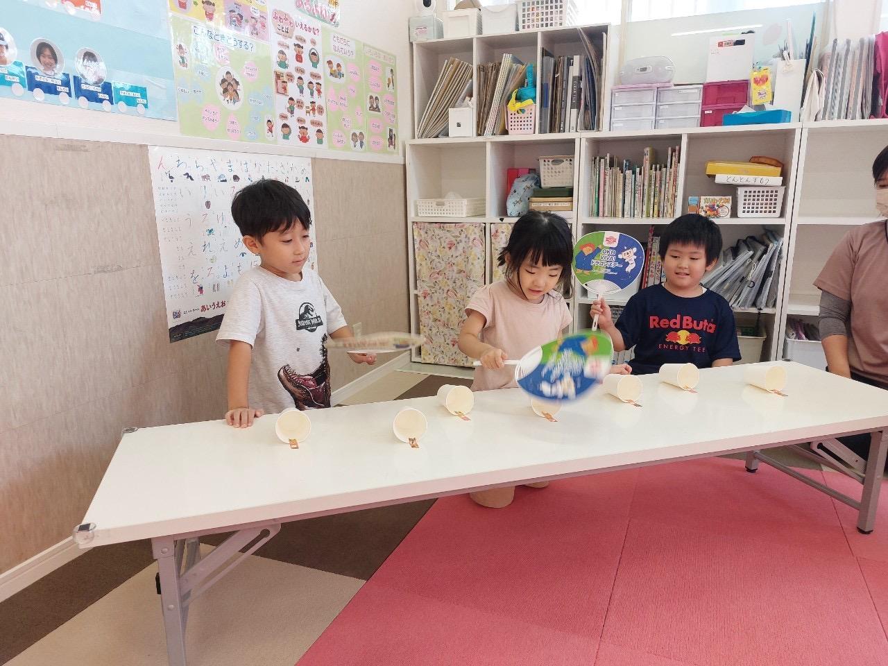 紙コップをうちわの風で立てるのは少し難しかったようですが、上手くいくと大喜び!