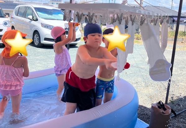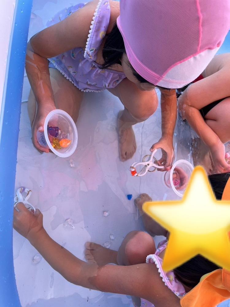 水鉄砲で恐竜やお化けをたおしたり、プールの中にある宝を探して洗濯バサミでユーフォーチャッチャーのように掴んで拾ったり、みんなの笑顔がたくさん見れました