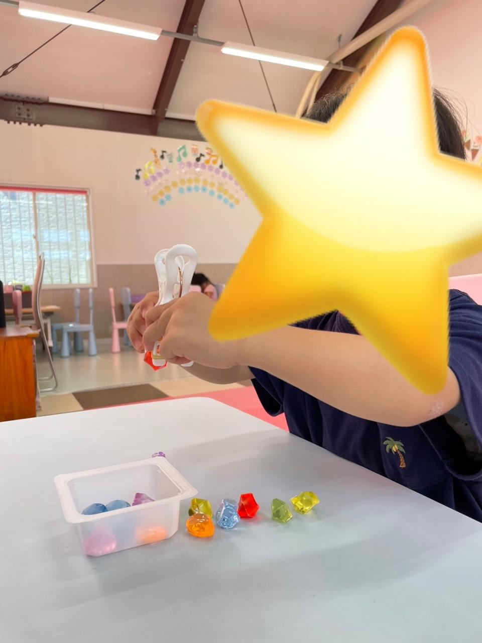 2歳児さんは指先を使ってポンポンを挟むプログラムをしました!