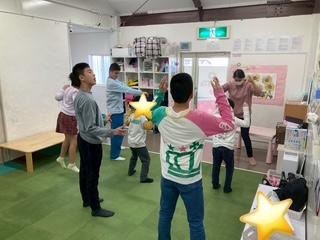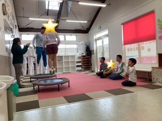 新しい友達が増えたので、友達や先生と握手をしたり名前を伝えあったりしながら、「あくしゅでこんにちは」を楽しみました。