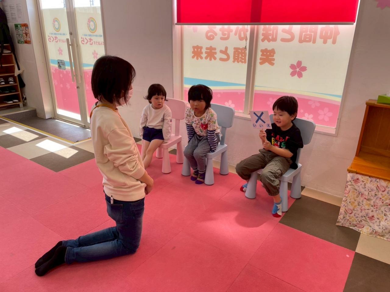 今日は、年少さんは手洗い表を見て手の洗い方を確認したり、年長さんは表を見ないで手洗いクイズに答えたりしました。