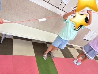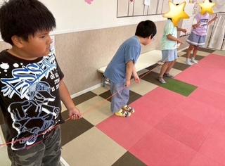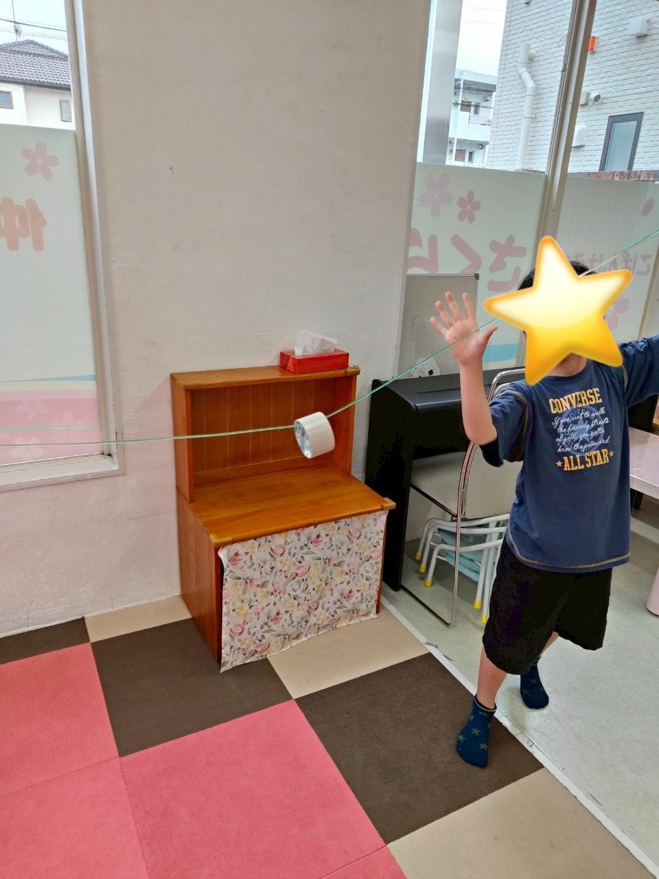 縄の端から端までトイレットペーパーの芯を移動させるロープコースターをしました☆