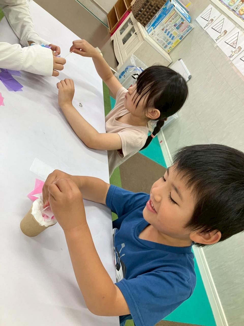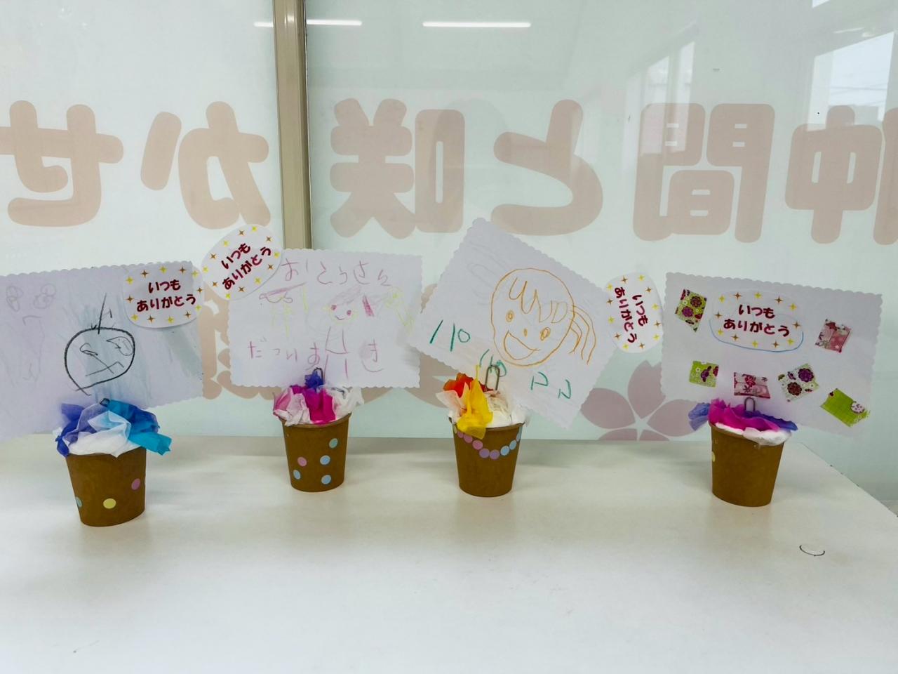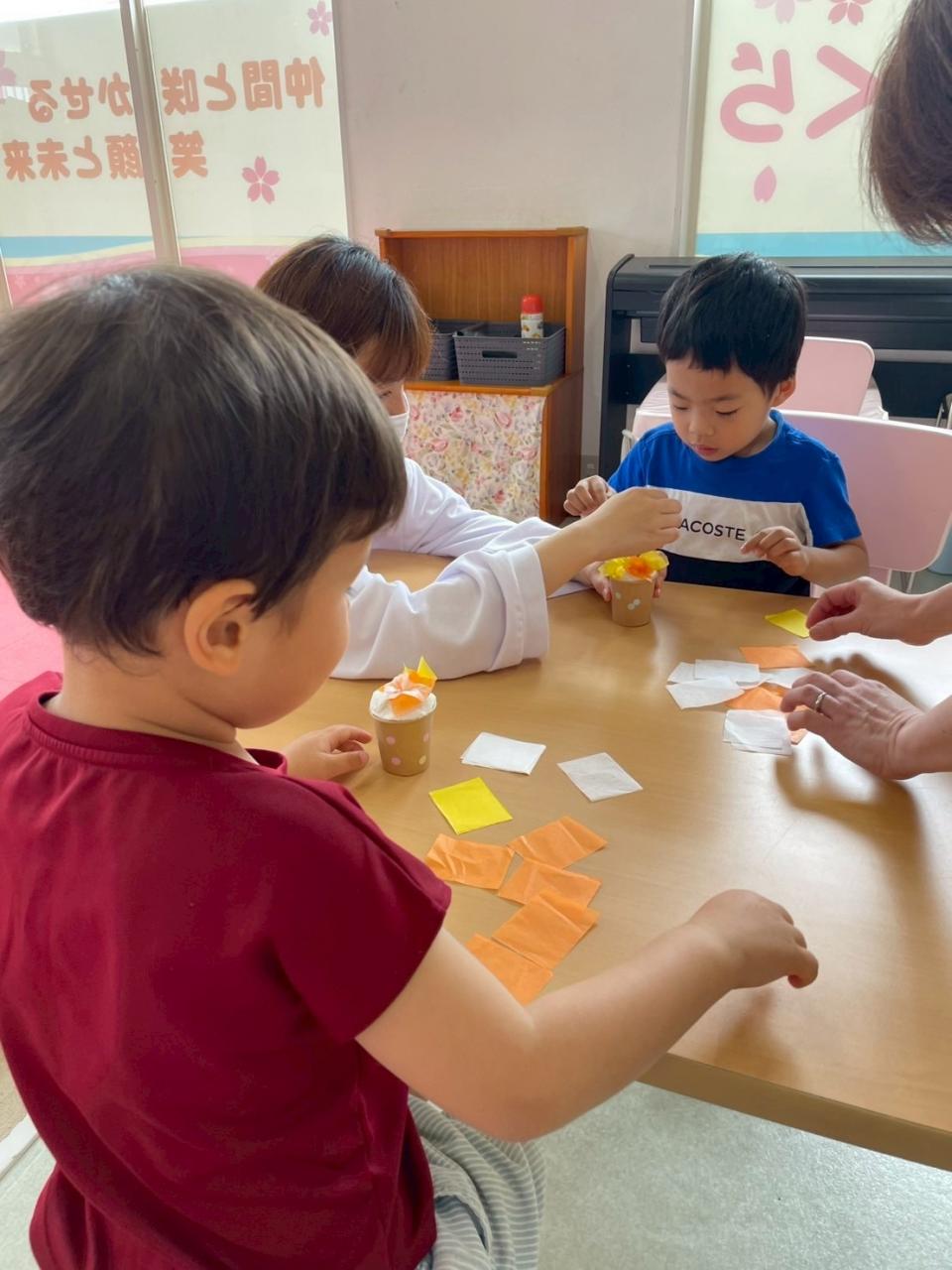 今日が一回目の子は、紙コップに丸めた紙と紙粘土を入れて、花紙を差し込み可愛らしいメッセージカードスタンドが出来上がりました☆