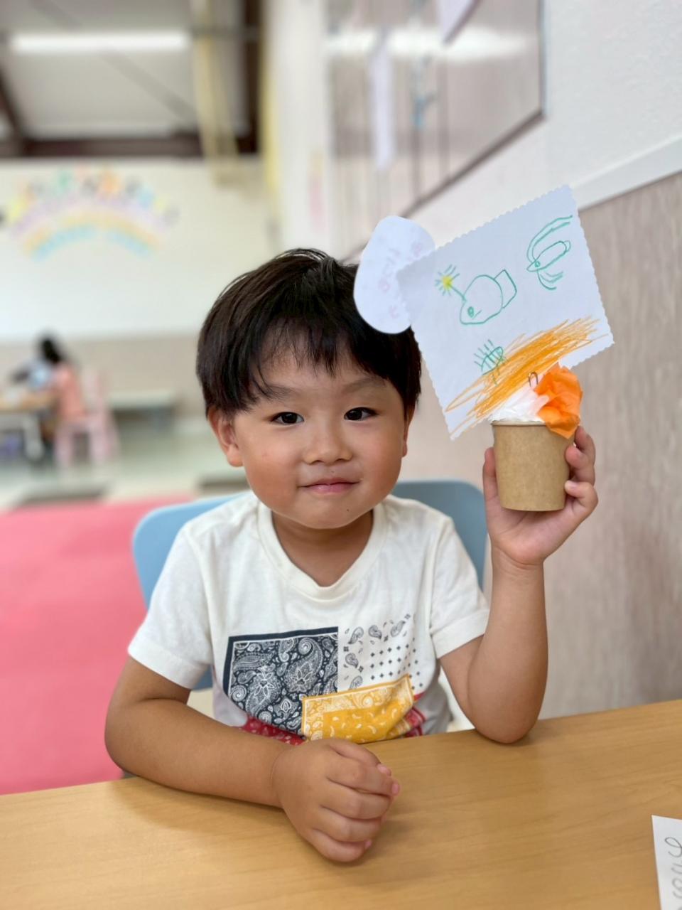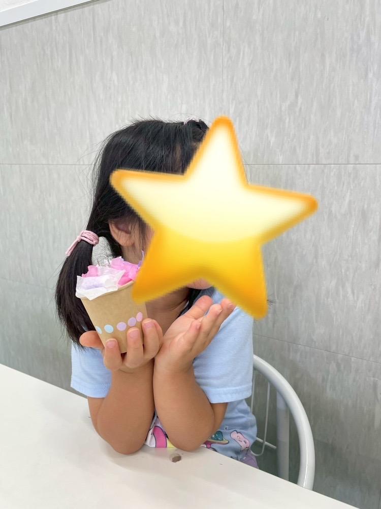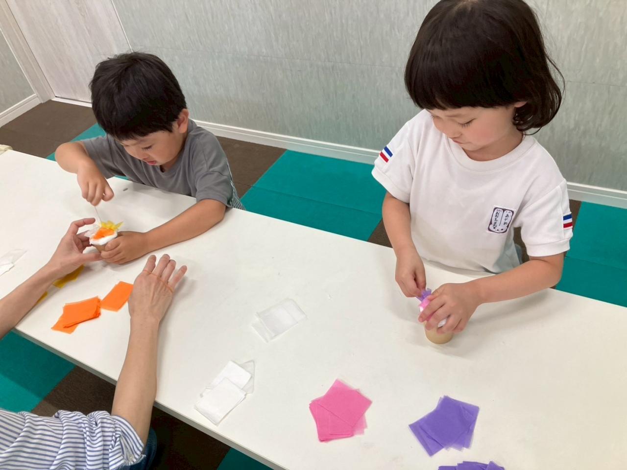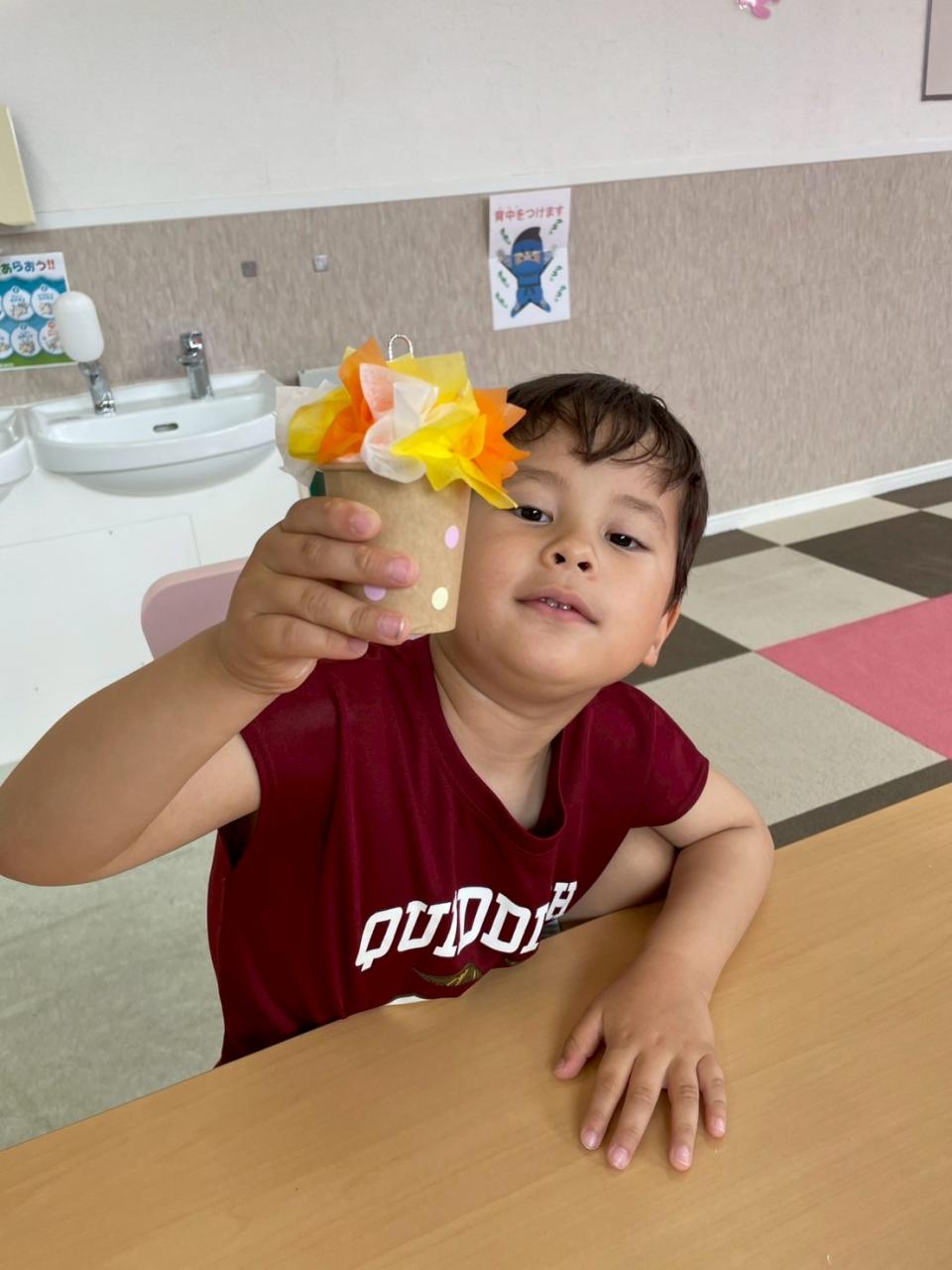 今日が一回目の子は、紙コップに丸めた紙と紙粘土を入れて、花紙を差し込み可愛らしいメッセージカードスタンドが出来上がりました☆