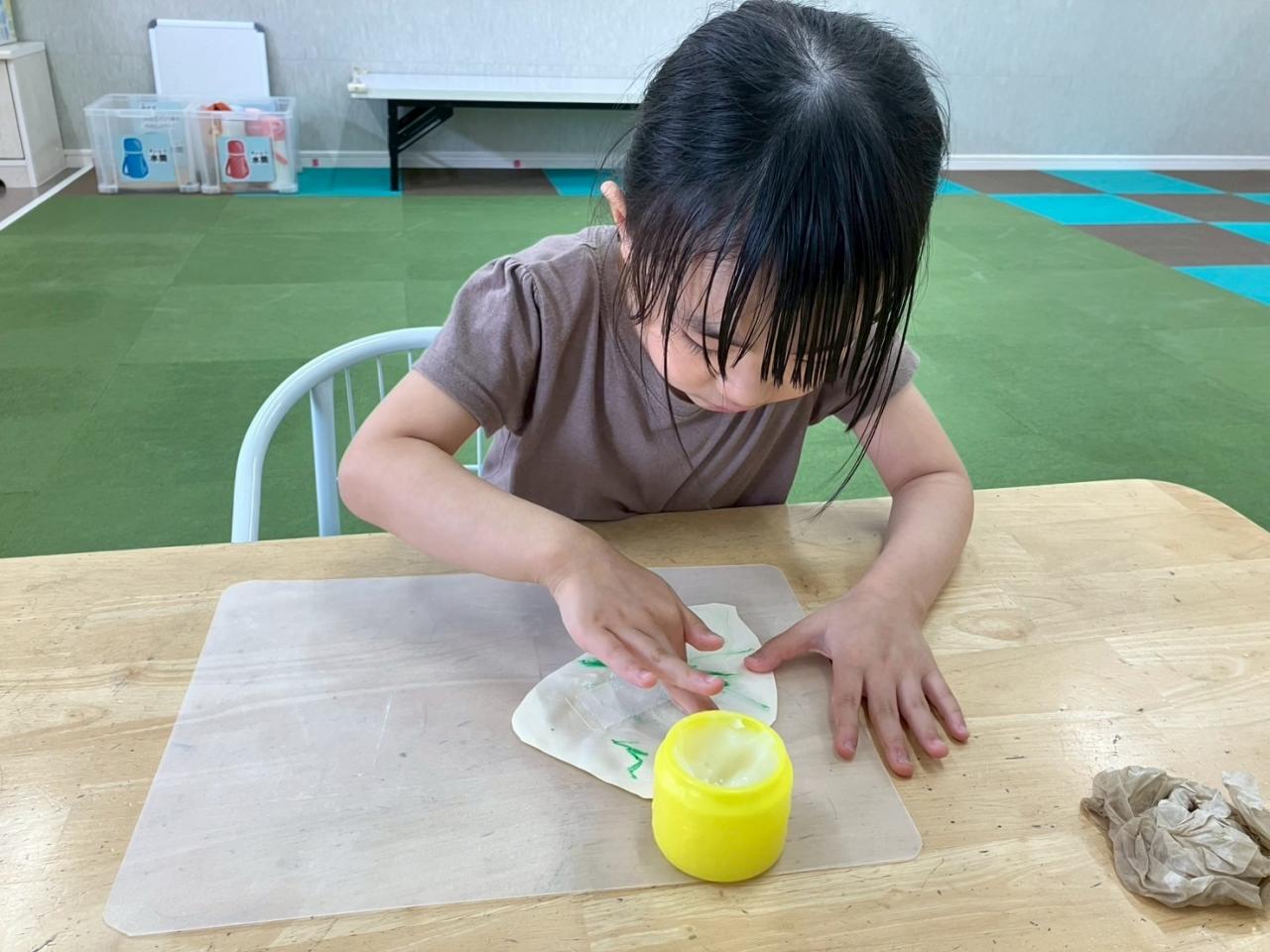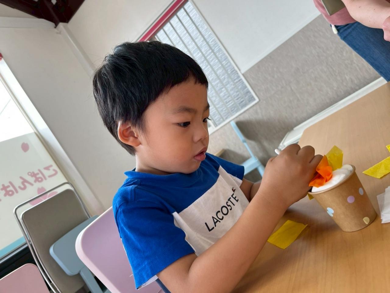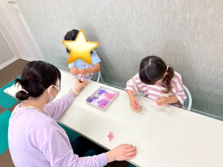 紙や紙粘土を丸めて紙コップに入れたり、綿棒で花紙を紙粘土に差し込んだりと手先を使って作り上げる作業が沢山ありました(*´꒳`*)
