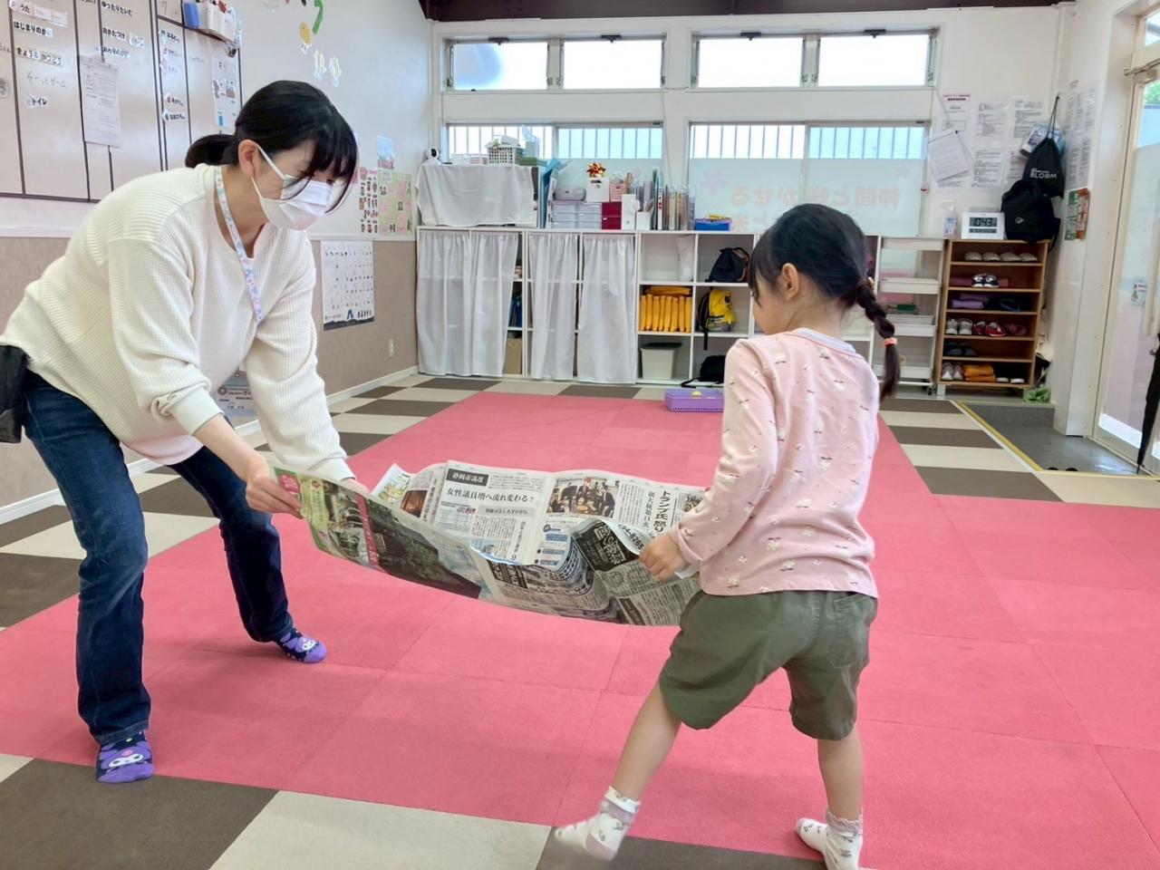 シーツ遊びでは先生と一緒に風船を運んでみたり