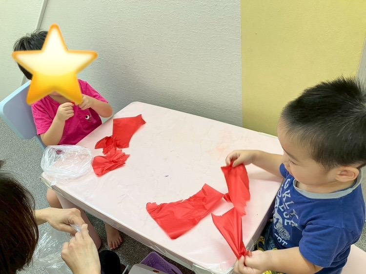 今日は、ビニール袋に花紙をちぎって入れてビニール袋風船を作りました。