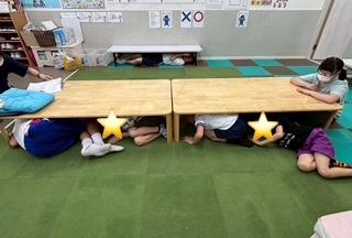 地震にまつわる○×クイズ、防災頭巾の被り方の確認、頭を守る姿勢、外に避難して点呼をしました!