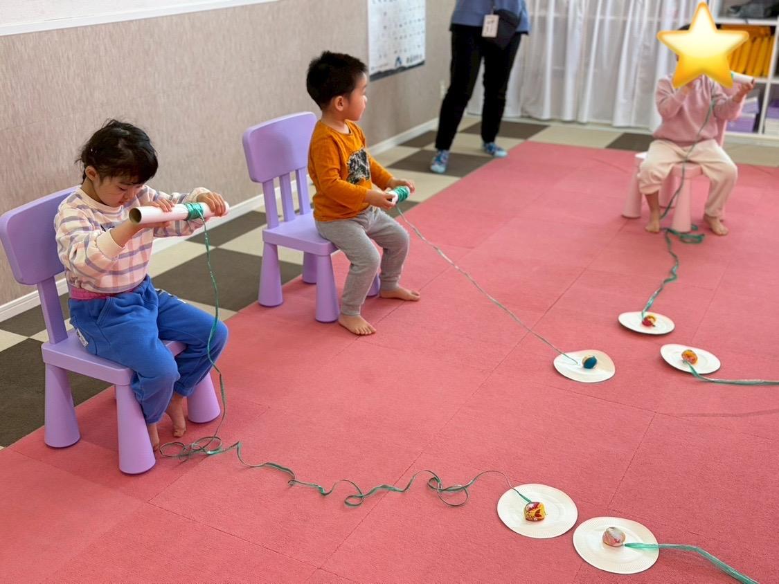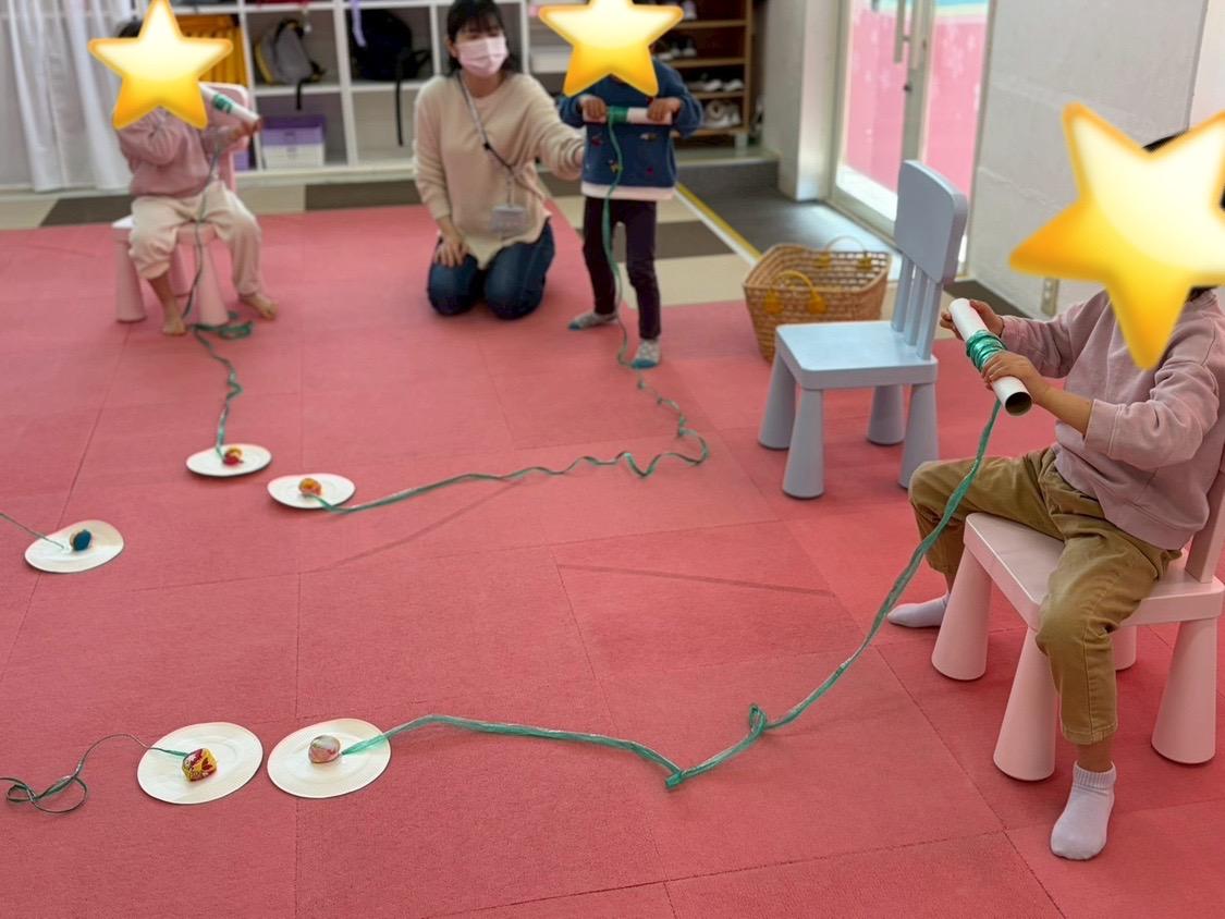 お手玉を乗せて、落とさないように巻いてみよう!の時には